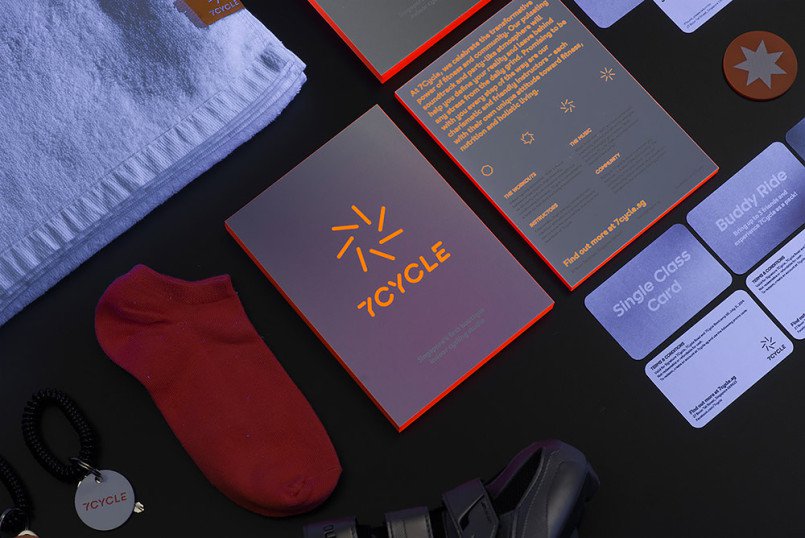 这个动画的标志有七个旋转辐条,在保持个人7天的锻炼和营养健康制度的重要性的同时,也为群体周期元素提供了补充。”在品牌拼贴中,霓虹灯橙色的口音与柔和的渐变调色板一起使用,以更轻的触感突出品牌的强度元素。在紫外线下,霓虹灯在黑暗中发光,这说明了7周期充满活力的聚会体验。